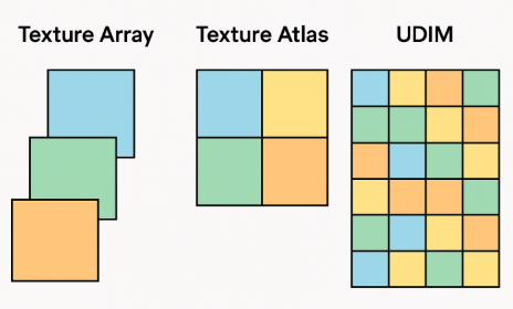 Texture Array와 유사한 형태로는 UDIM이 있는데 쉽게 생각하면 층층이 쌓아올려 사용하는것이 Atals, 옆으로 펼쳐서 번호를 매겨 사용하는(1000,1001,1002등)것이 UDIM이다.