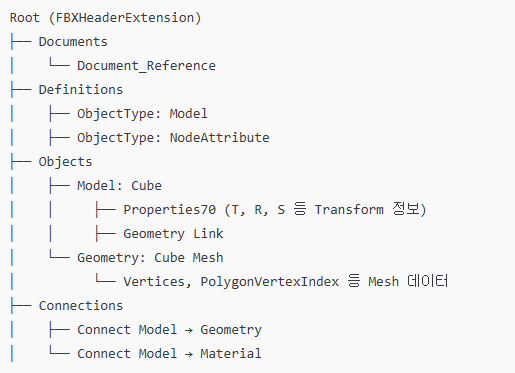 - FBXHeaderExtension : FBX 파일 버전, 생성자 정보 등