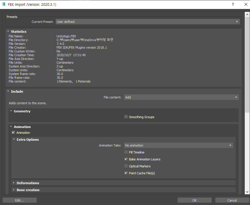 Smoothing Group 옵션을 체크하면 FBX 파일의 기존 Smoothing Group 데이터는 무시되고, Importer가 임의로 새로운 Smoothing Group을 생성하게된다. 기존 정보를 유지하고 싶다면 체크를 해제해야 한다.