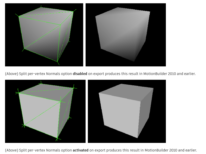 3ds Max로 다시 가져오기 위해 원래 3ds Max 엣지의 연속성을 유지하면서 적절한 엣지 연속성을 사용하여 3ds Max에서 내보낸 FBX 파일을 MotionBuilder로 가져오려면 버텍스 노멀 분할 workflow를 참조. MotionBuilder 2010 이하 구버전 대응 이외에는 사용하지 않는 것이 좋다.