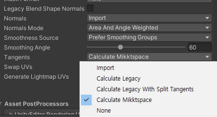 유니티의 경우 해당 Model에서 Normal과 Tangents값을 엔진 내부에서 어떻게 사용할지 선택할 수 있게 옵션을 제공 한다. import의 경우 fbx의 값을 그대로 사용하고 Calculate의 경우 다시 계산, None의 경우 계산하지 않는 옵션이다. 최신버전은 Mikkt를 지원하면서 좀 더 복잡해졌다. 본 포스팅에서는 여기까지는 설명하지 않는다.