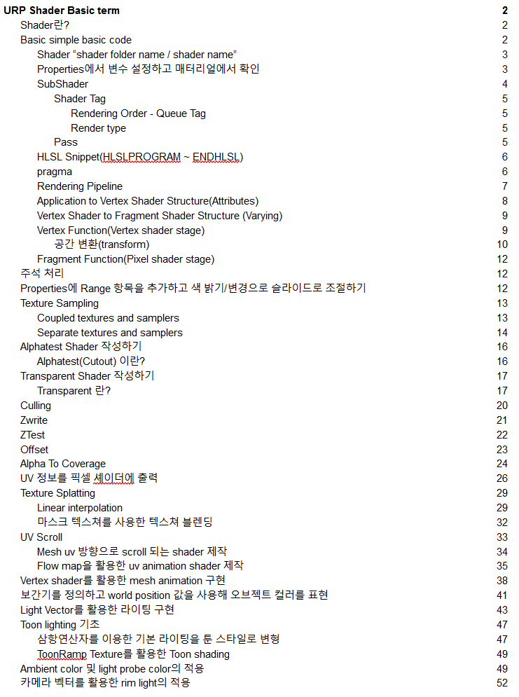 URP Shader Training에 사용된 문서. 기본 Opaque, Alphatest, Transparent 3종류의 셰이더 작성과 기본 응용을 포함하고 있다.