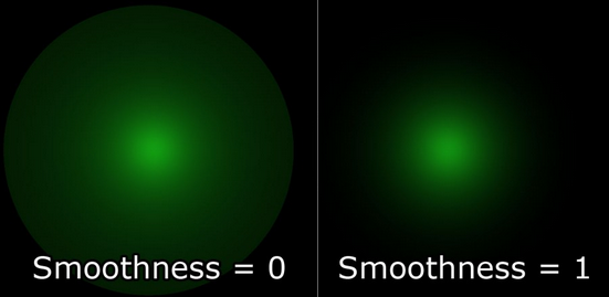 선택적으로, 위 방정식에서 0.75f를 매개변수화하여 빛 감쇠의 부드러움을 조정할 수 있다. smoothness 계수가 0.0이면 빛의 강도가 빛의 최대 범위까지 1.0으로 유지되고, 계수가 1.0이면 빛의 강도가 빛의 전체 범위에 걸쳐 보간된다.