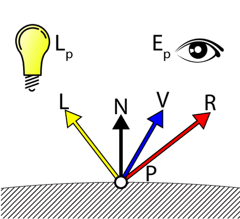 라이트 벡터 L은 음영 처리되는(shaded) 지점에서 광원을 가리키는 벡터이므로, 반사 벡터를 계산하기 전에 L의 값을 음수화하여 광원에서 음영 처리되는 지점을 가리키도록 해야 한다. 반사 벡터(R)와 뷰 벡터(V)의 내적 결과는 재질의 반사광 변수 값의 거듭제곱으로 계산되고, 빛의 색상에 따라 변조된다. (0~1) 범위의 반사광 값은 의미 있는 반사광 값이 아니라는 점을 기억하는 것이 중요. 반사 조명에 대한 자세한 설명은 이전에 작성한 "DirectX 11의 텍스처링 및 조명" 문서를 참조