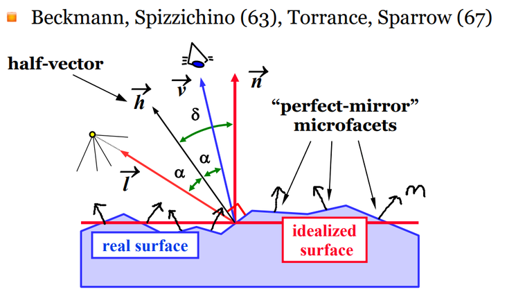 2017 – 미러 D 관찰은 미세 측면의 노멀이 M = h를 충족하는 비율(아래 그림에서 원으로 표시)을 계산하는데 사용됩니다. 조건이 충족되면 미세 표면이 L에서 V로 빛을 반사하고 수식 사이에 m-Term 벡터가 작성됩니다.