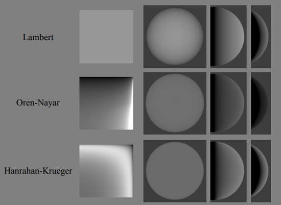 Three basic BRDF diffusion models: Lambert, Oren Nayar, Hanrahan Krueger