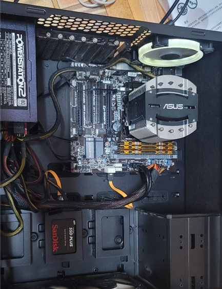 HDD 트레이에는 하나만 들어가고 상부에 하나 더 달아야 함. 파워가 일반 ATX보다 커서 트레이랑 간섭이 생겨서 바탕에 고정을 못시켰다. 후면부 선 정리도 빡센건 덤... 지금 하려니 좀 지쳐서... 이건 추후에 할려고 미뤄놨다.