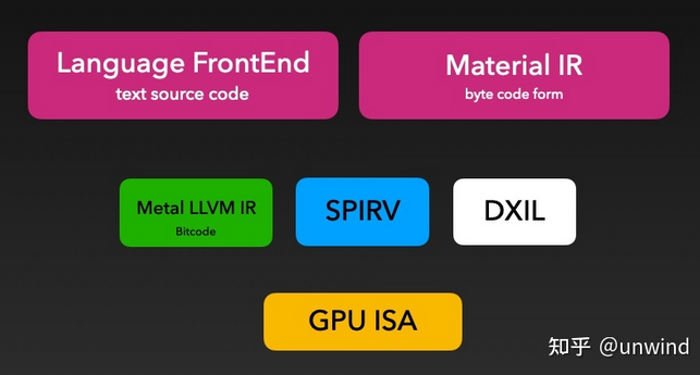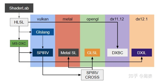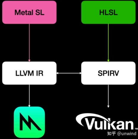 Metal Shading Language는 C++14를 기반으로 제작되었다. Metal 컴파일러에 의해 생성된 바이너리 셰이더는 실제로 표준 LLVM BitCode다. Metal의 내장 함수를 SPIRV의 내장 함수/클래스(metal::rendercommand/ metal::commandbuffer는 비교적 복잡함)에 매핑하면 Metal Bitcode를 SPIRV로 이진 변환을 쉽게 완료할 수 있다. Metal SL 컴파일러는 비공개 소스이지만 인터넷에는 오픈 소스 Metal SL 컴파일러(floor)를 구현한 사람들도 있다. 현재 Metal API는 Binary의 Shader 익스포트를를 제공하지 않는다. 바이너리 코드를 생성하려면 MacOS의 Metal 오프라인 컴파일러를 사용해야 하므로(로딩 속도를 향상시키기 위해 Shader Cache에 사용됨) floor는 주의할 가치가 있는 프로젝트일 수 있다.