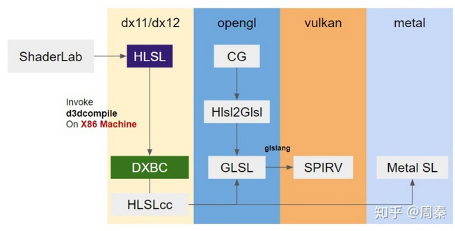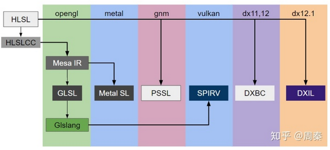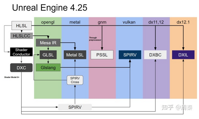 Unity와 Unreal은 모두 크로스 플랫폼 게임 엔진이며 크로스 플랫폼의 기반에는 Shading Language와 렌더러가 포함된다. 셰이더 언어에서 Unity와 Unreal은 모두 널리 사용되는 HLSL을 선택했으며 필연적으로 크로스 플랫폼 셰이더 컴파일 체계를 필요로 하게 된다.