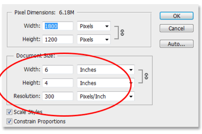 이미지 크기를 포토샵에서 inches로 변환했을시에는 인식하는 사이즈 크기가 달라진다. 이는 출력 사이즈와 디지털로 인식하는 이미지의 크기에서 오는 차이로 인치, 센티미터의 경우 이미지 출력 사이즈를 기준으로 측정하기 때문이다. 포토샵 이전 버전에서는 이미지 사이즈와 실제 출력 사이즈를 각기 관리했으나 어느순간부터 이미지 사이즈나 출력사이즈를 선택할 수 있게 변경되었다.