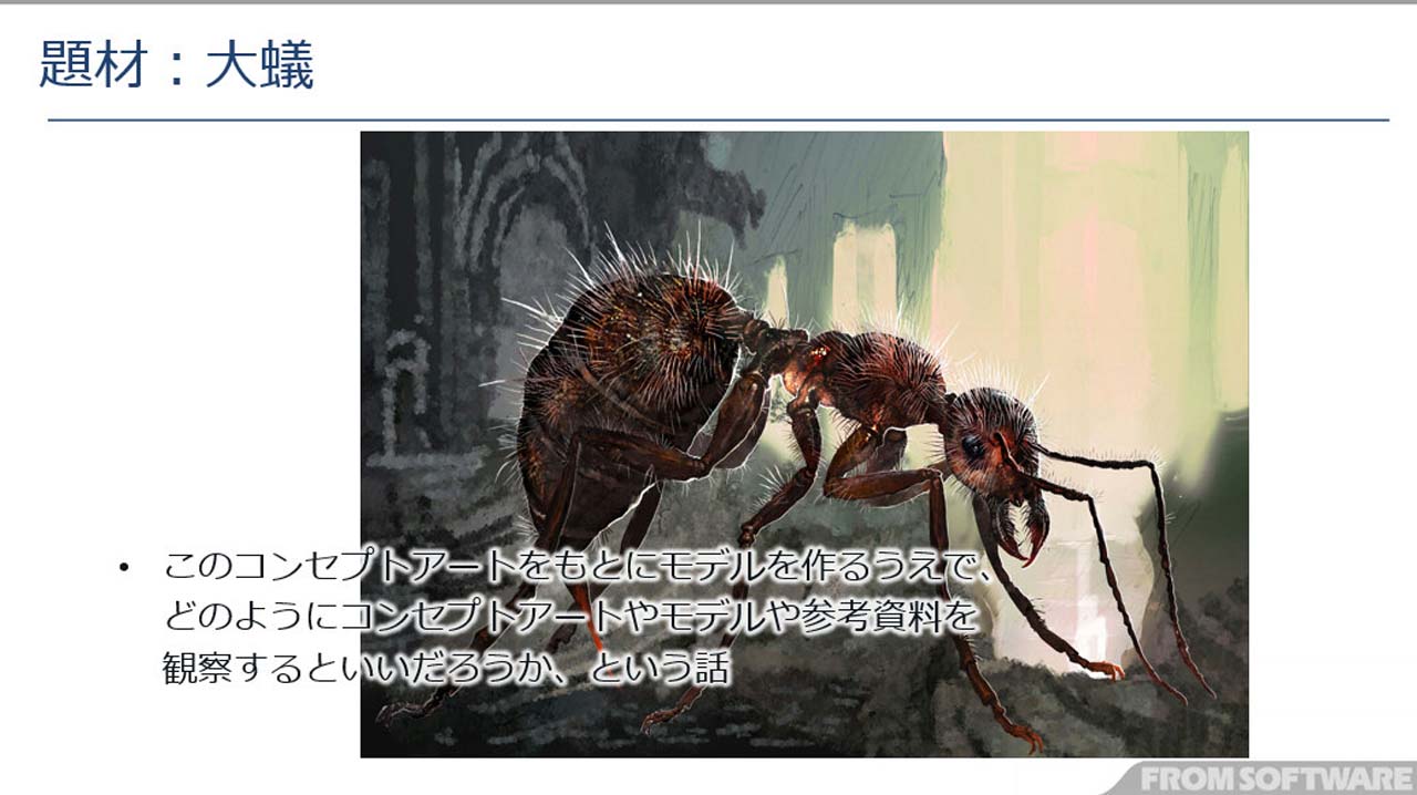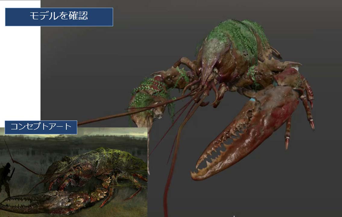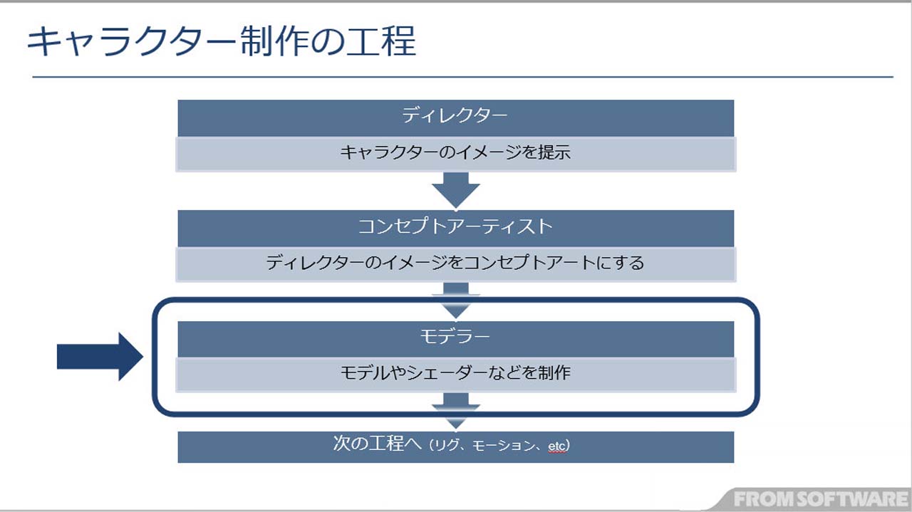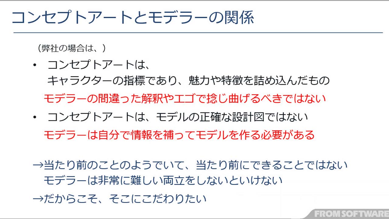 여기서, 프롬 소프트웨어에 있어서의 캐릭터의 제작 공정에 대해서 해설이 있었습니다. 우선 디렉터로부터 이미지의 제시가 있어 그것을 바탕으로 컨셉 아트가 제작됩니다. 모델러는 이 컨셉 아트를 바탕으로 모델이나 셰이더를 제작해, 리그나 모션 등의 후공정에 계승합니다.