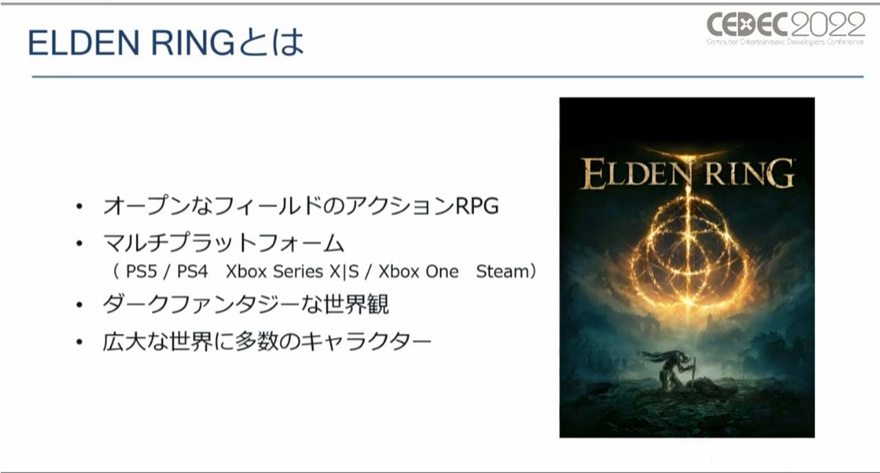 일본 최대 규모의 게임 업계 컨퍼런스 「CEDEC2022」가 2022년 8월 23일(화)부터 8월 25일(목)까지 개최되었습니다. 2일째인 8월 24일에는, 주식회사 프롬 소프트웨어의 3D그래픽 섹션 서브 리더 후지마키 료씨가 등단해, 「ELDEN RING의 대량의 캐릭터 모델을 제작한 팀의 「엄선」자기 분석」이라고 제목이 강연되었습니다. 현실에 존재하는 생물을 모델로 한 캐릭터부터 비현실적인 이형 캐릭터까지 다양한 버라이어티로 게임을 물들이는 모델이 어떻게 탄생되었는가. 그 궤적이 해설된 본 강연을 리포트합니다.