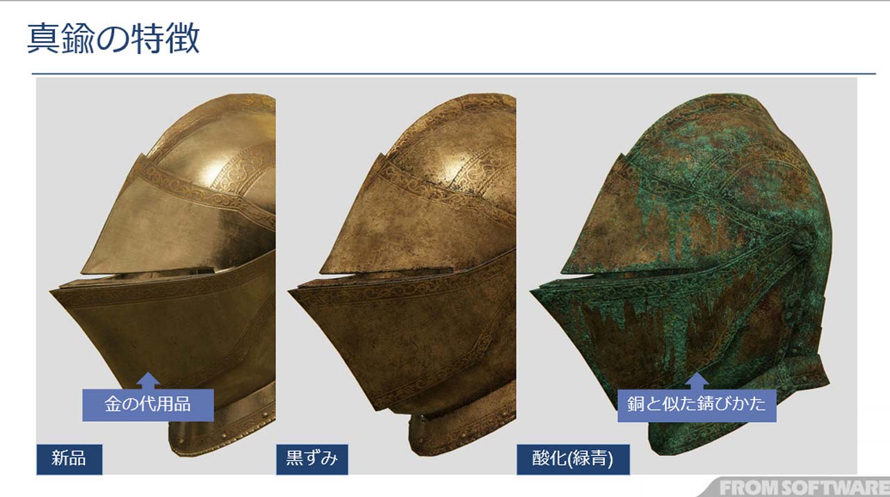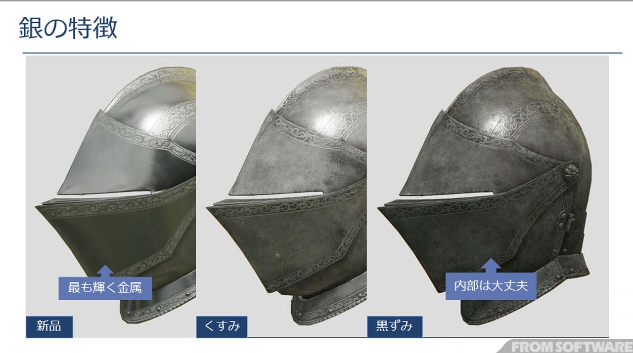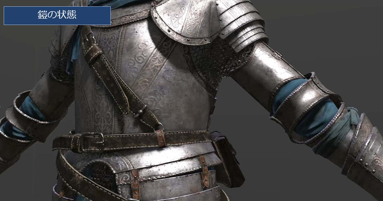 갑옷의 상태에 따라 착용자의 사람이 되어도 표현할 수 있다는 점도 말해졌습니다. 더러운 방법 하나를 매우 꼼꼼하게 예쁘게 좋아하는 사람이라면 입고있는 갑옷은 예쁘고, 어색하고 물건을 거칠게 취급하는 사람이라면, 상처와 더러움은 심해질 것이다, 라는 표현으로 연결됩니다. 경년 열화의 모습으로, 새로운 것을 살 수 있을 만큼의 재력이 있는지 없는지, 붙은 상처의 모습으로 어떤 상대와 싸워 왔는지, 라고 하는 정보를 연출할 수 있습니다.