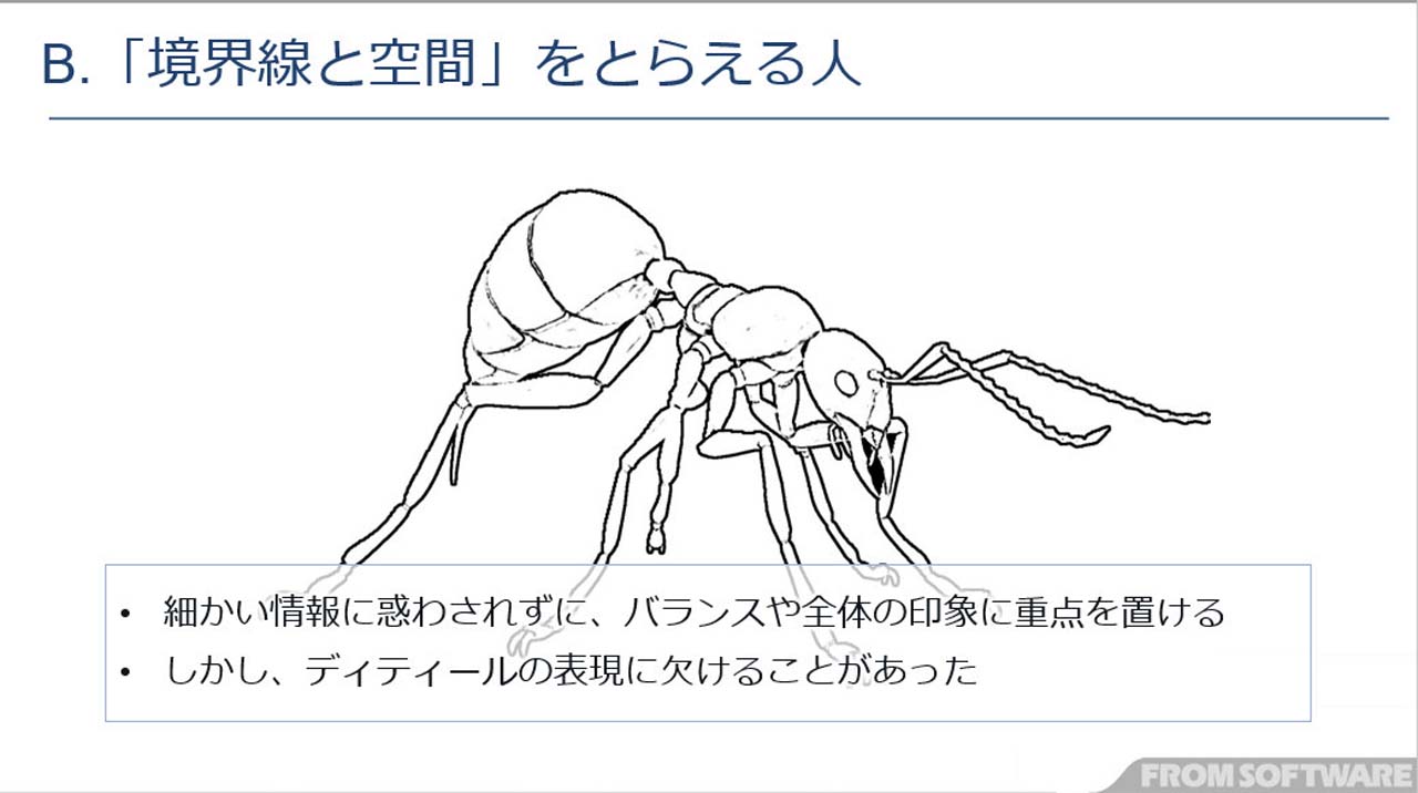소재가 된 것은 개미입니다. 이 컨셉 아트를 모델에 떨어뜨리는 데 있어서, 사람에 의해 관찰의 방향성이 나뉘는 경향이 있었다고 합니다. 경향은 크게 2개로 나뉘어, 1개는 형상의 음영을 인식해 입체로서 파악하는 타입 , 다른 1개는 경계선이나 공간에 있어서의 레이아웃을 인식해 윤곽을 포착하는 타입 이라고 한다. 이 분류는 그림을 배우는 데 피할 수 없는 '음영과 모양'에도 부합하는 개념이기 때문에 인간의 인지 기능에 공통적인 요소라고 할 수 있을 것 같습니다.