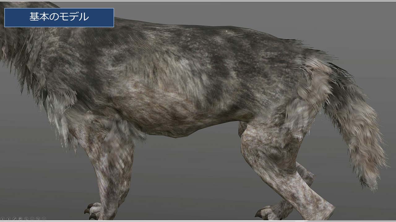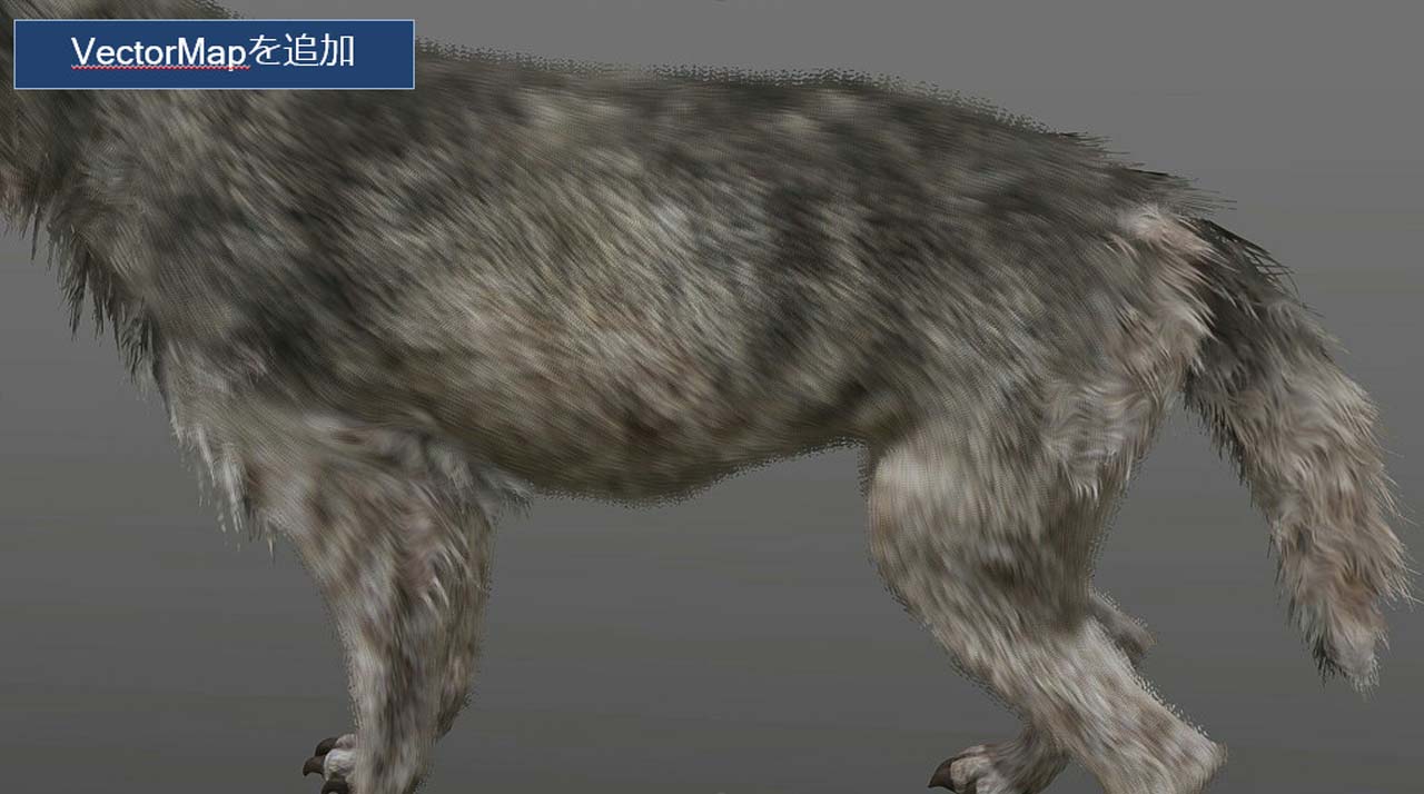 털에 관한 표현으로서, 적층 퍼 라고 하는 테크닉도 소개되었습니다. 피부의 다각형을 복제하고 쌓아 노이즈 같은 텍스처로 알파를 빼는 것으로 털을 표현하고 있습니다. 그대로라고 외형이 거칠어져 있기 때문에, 포스트 이펙트로 흐리게 부드럽게 해, 털 같은 방향에 맞추어 VectorMap 텍스처를 준비해 조정하는 것으로 매끄럽게 특정 방향으로 흐르는 털 수준을 실현합니다. 이 방법은 품질보다 간편함을 중시한 기법으로 해설되었습니다.