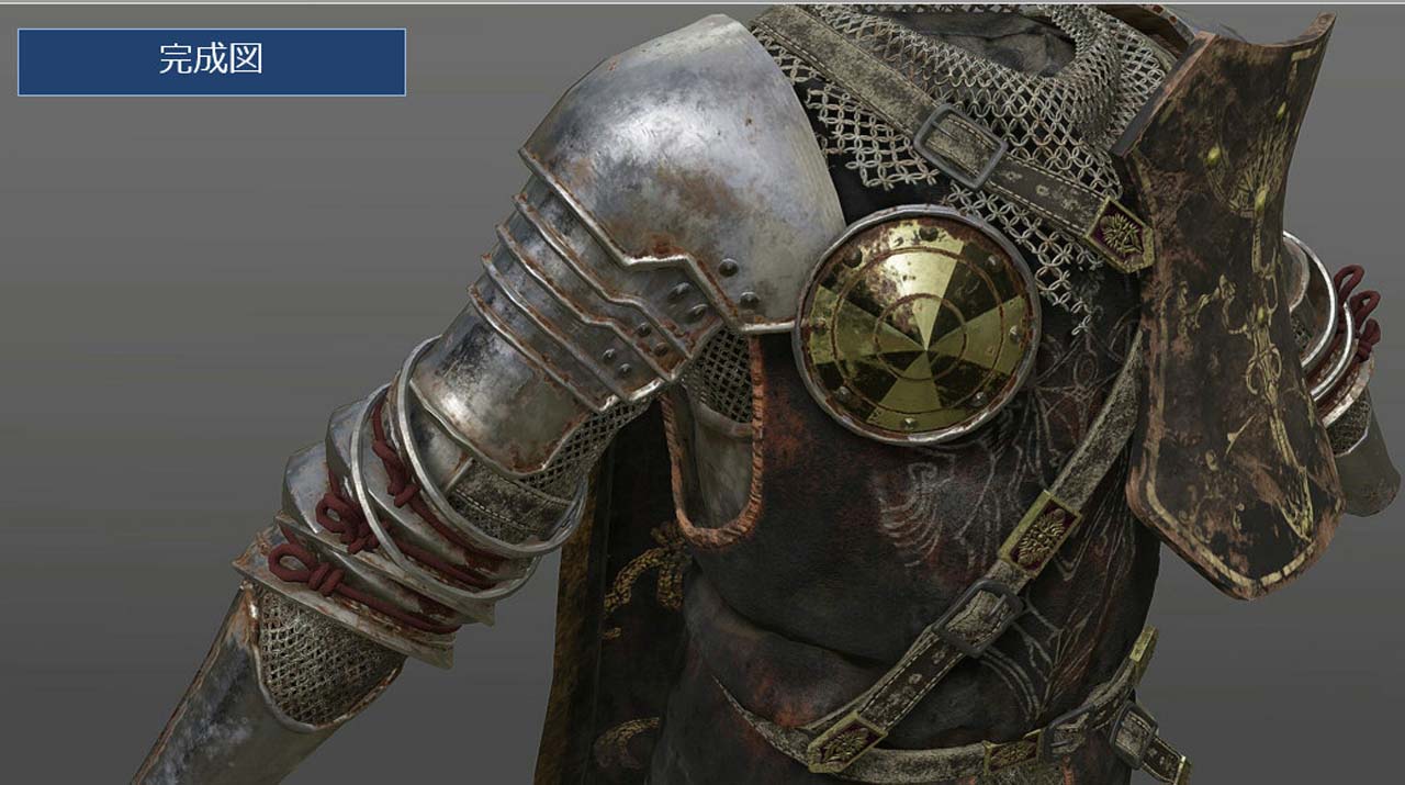 재질은 모델링 공정에서 머티리얼과 텍스처의 제작 으로 표현됩니다. 컨셉 아트에서는 우선 그려지지 않는 정보이므로, 여기를 어떻게 해석하는지가 모델러로서 중요한 일이 됩니다. 여기에서는 갑옷의 이야기로부터의 연결로, 철·은·주석이라고 하는 소재를 이해하는 것으로, 어떤 표현으로 발전하는지가 말해졌습니다.