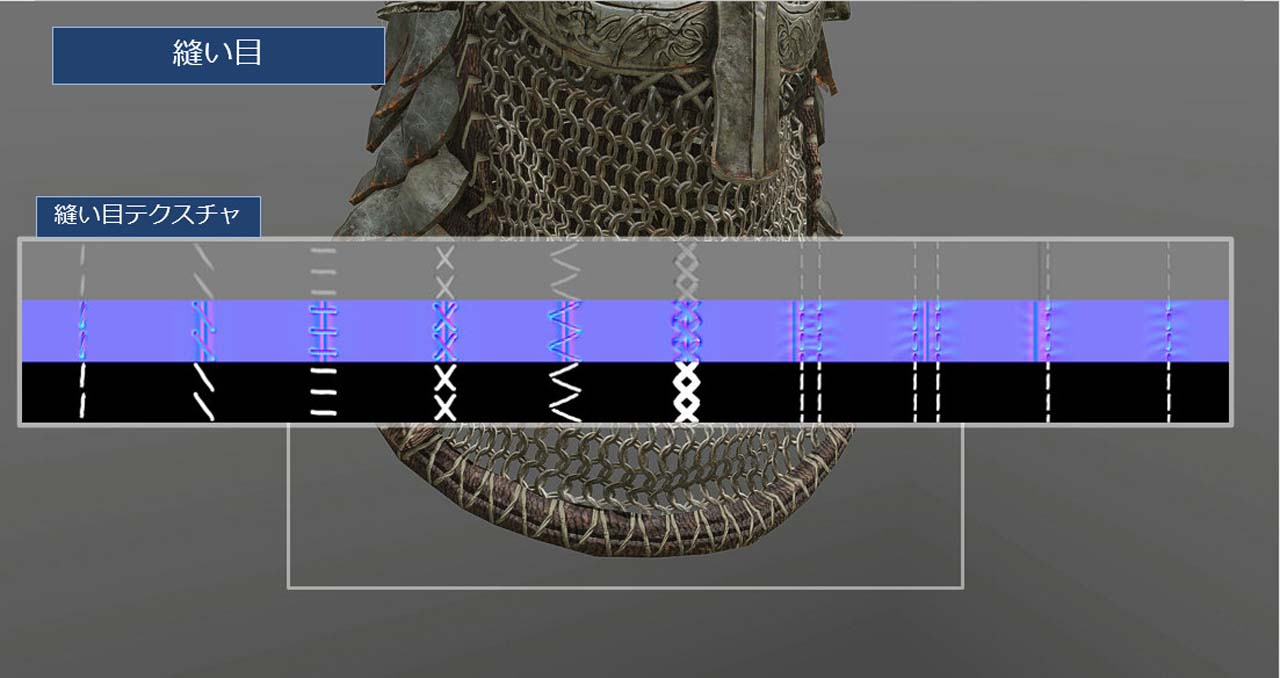 갑옷 등의 장비에 대한 조건 포인트로서, 솔기의 형상 이 잘 나옵니다. 거기서 사용한 것이 솔기를 다른 UV로 추가하는 쉐이더 입니다. 솔기의 텍스처를 프리셋으로 준비해, 전용의 UV로 전개하는 것으로, 원하는 패턴을 선택해 적용할 수 있었습니다.