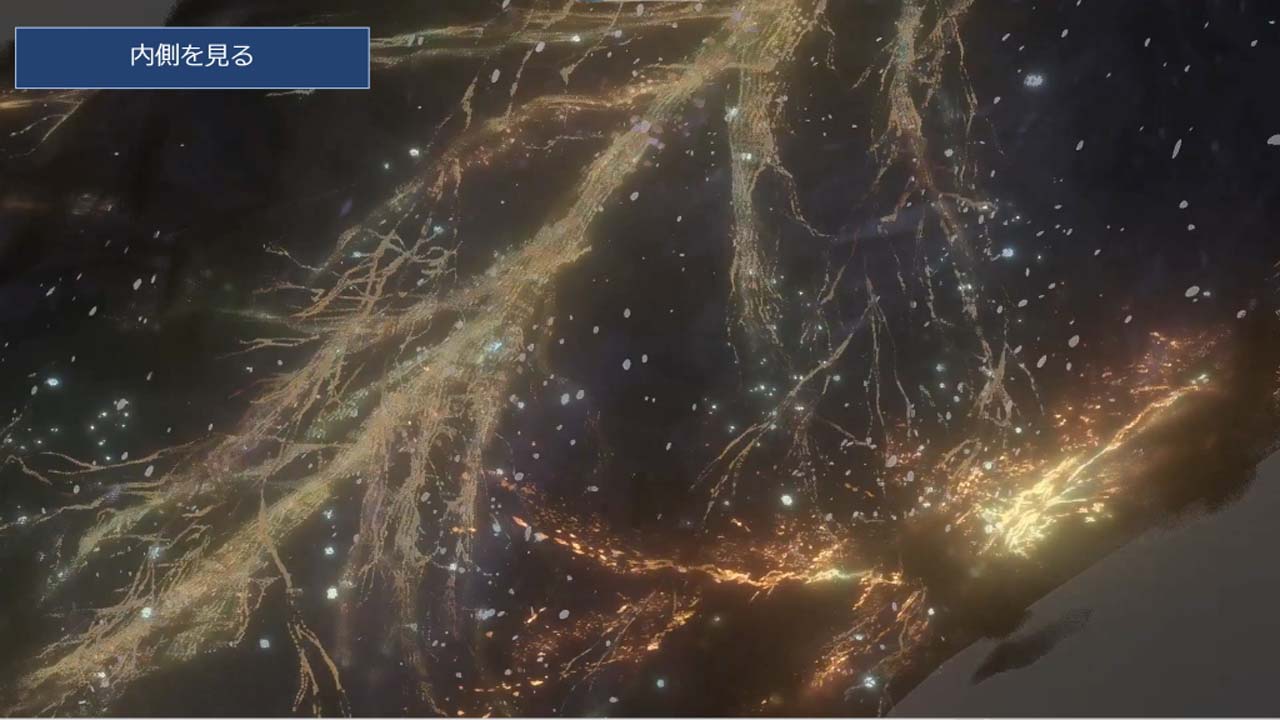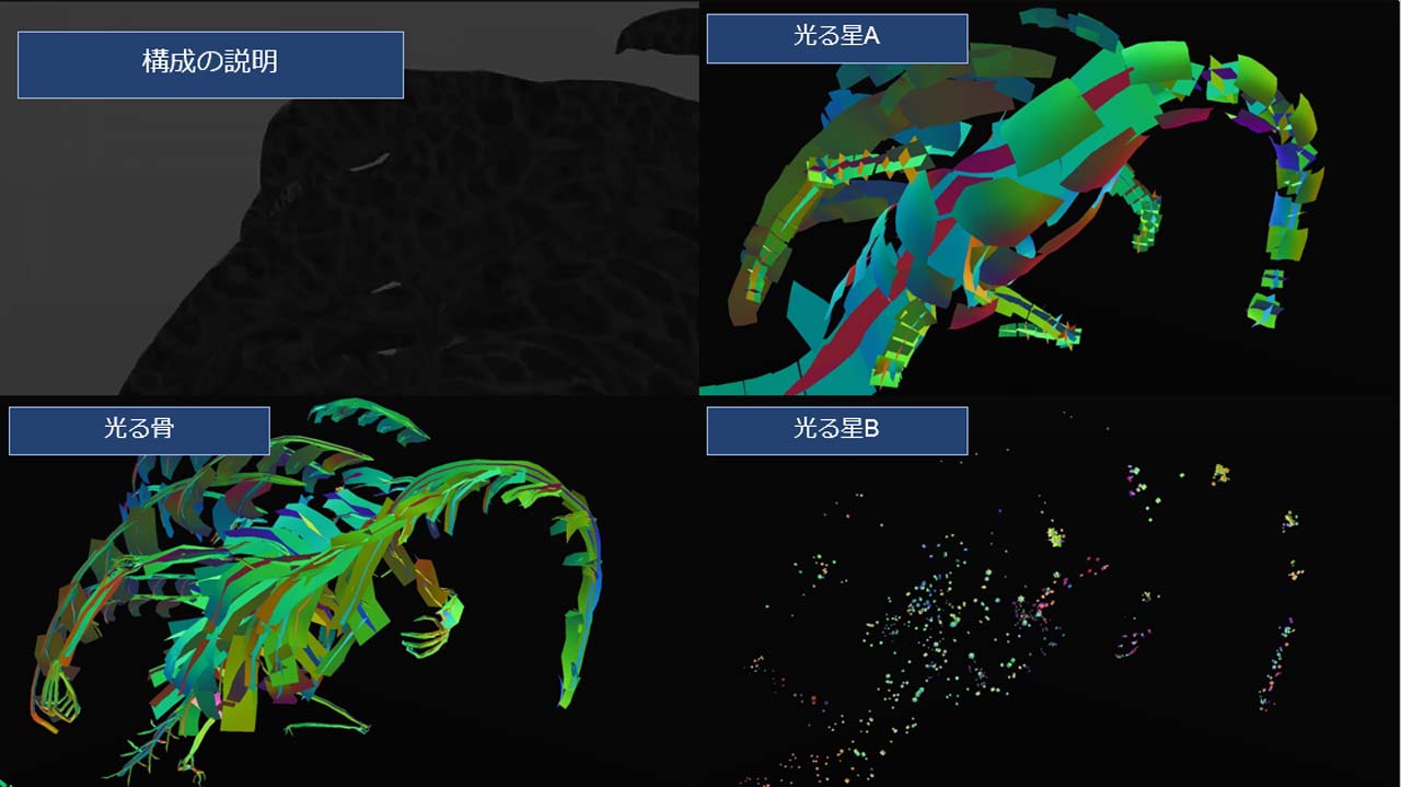 기초가 되는 검은 다각형이 있어, 그 윤곽을 흐리게, 가스와 같은 것을 흘리고, 빛나는 뼈와 빛나는 별을 넣고, 마지막에 안구를 넣어 완성시키고 있습니다. 가스와 척추에는 셰이더로 힘의 흐름과 같은 움직임을 부여하고 있습니다. 어느 파트도 셰이더 있어 만들어져 레이아웃 되고 있다고 합니다.