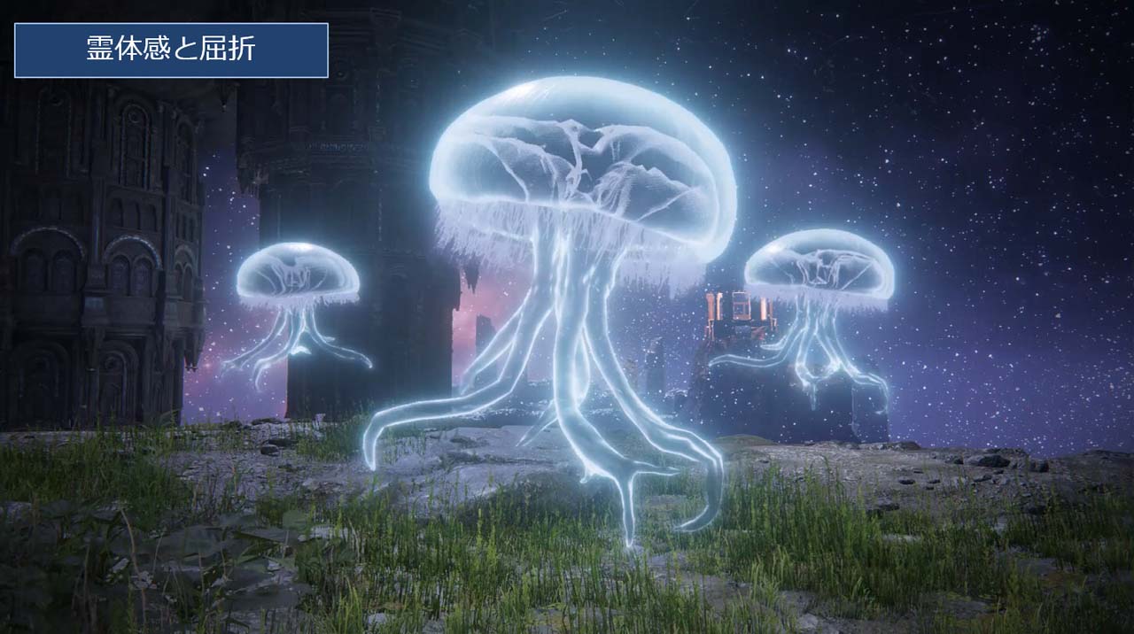 판타지 세계 특유의 표현으로서 영체감과 굴절의 셰이더 가 소개되었습니다. 통상의 반투명은 아니고, 안쪽의 경치를 붙이는 처리로 의사적으로 투과 시키고 있습니다. 배경의 왜곡도 들어 있습니다만, 영체이므로 겸손하게 하고 있다는 것.