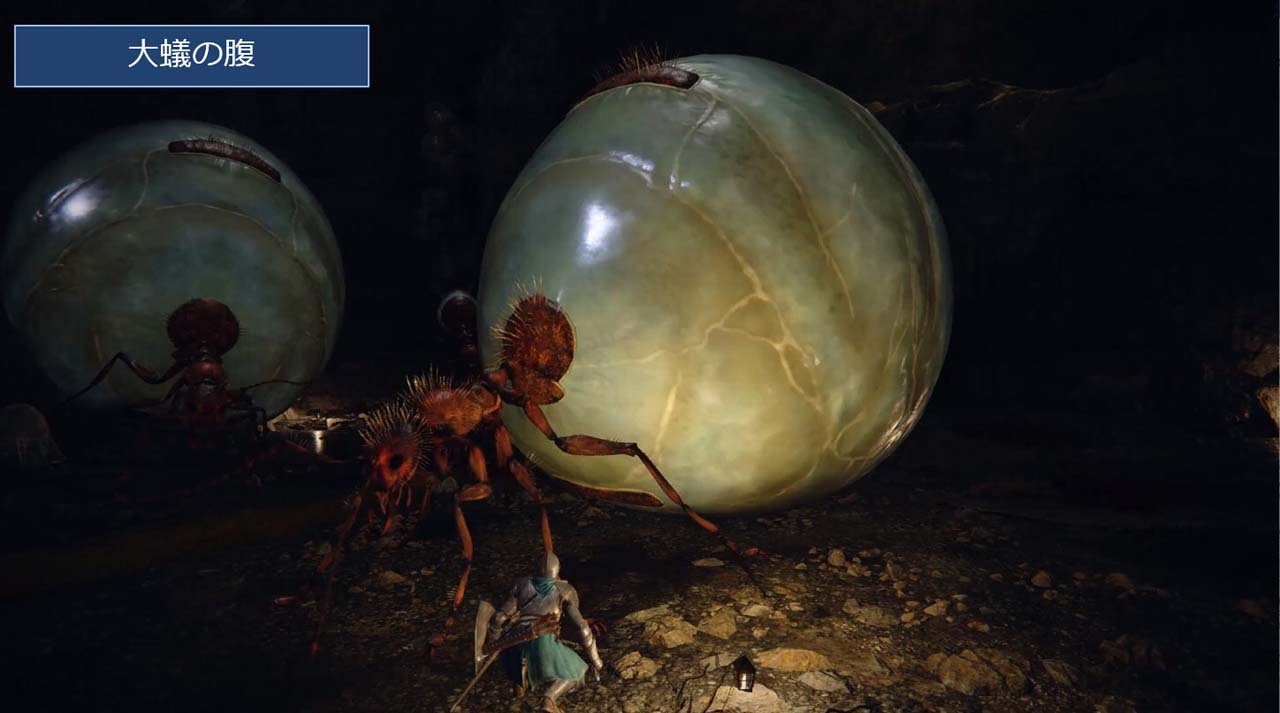 큰 개미 중에는 배가 크게 부풀어 오르고 있는 개체가 있습니다만, 「배에 무엇이 들어가 있는지 모르는, 득체의 모르는 표현을 하고 싶다」라고 하는 이유로부터 특수한 쉐이더가 이용되었습니다. 카메라 위치의 변화에 의해, 배의 내용이 모야모야와 움직이고 있는 것 같은 분위기를 내고 깊이감을 만들고 있습니다 .