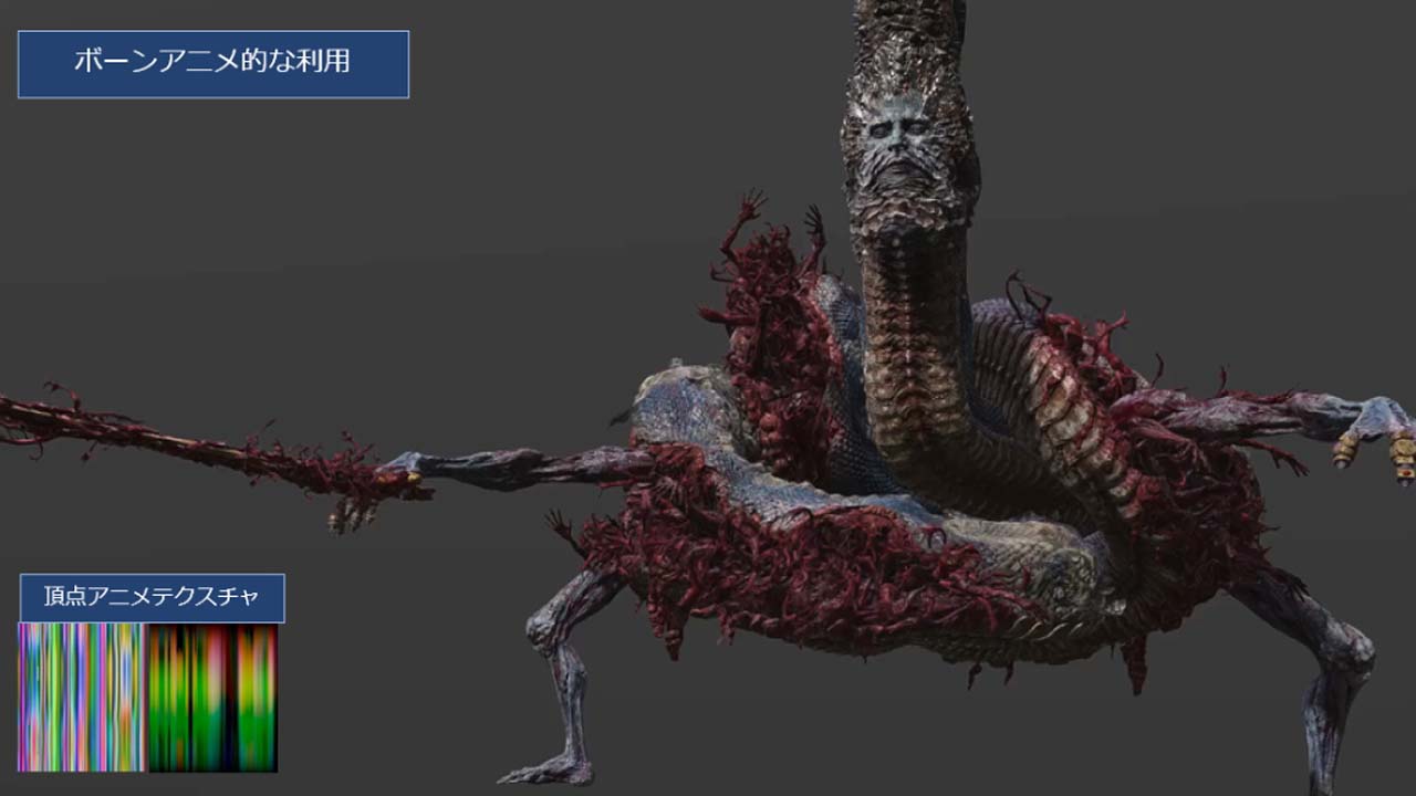 애니메이션적인 이용 방법으로는 무수히 자라는 팔이나 촉수 등이 번쩍이는 모습 을 표현하고 있습니다. 본에 의한 애니메이션보다 저비용인 것과, 파라미터를 장미 붙이는 것으로 복잡성을 가지는 바리에이션을 만들기 쉬운 것이 장점이라고 설명되었습니다.