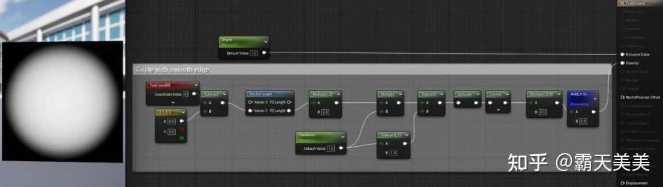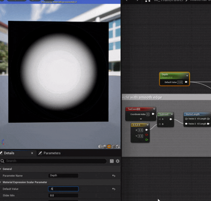 그림에서 발자국이 그려진 머터리얼이 표시되어 있으며, 중심에서 주변 영역으로 점진적으로 변하는 원을 구성합니다. Depth And Hardness는 Manager 블루프린트에서 전송한 데이터입니다. Blend 모드는 그리는 영역이 일치할 때 이전 발자국을 덮어쓰는 결함을 방지하기 위해 Translucent를 사용한다는 점에 유의해야 합니다.