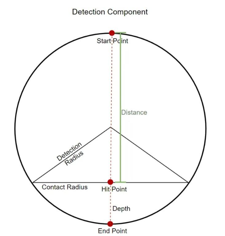 그림은 기본 감지 구성 요소가 수행하는 일부 작업을 보여줍니다. 여기서 저자는 구형 추적(Sphere trace)을 사용합니다. 단일 선 추적을 사용하지 않고 감지하려면 눈을 밟을 때 발과 눈 사이의 접촉이 점보다는 반구형 영역과 더 비슷하기 때문입니다. 그리고 위치 정보 외에도 반경, 깊이 및 기타 관련 정보도 필요합니다.