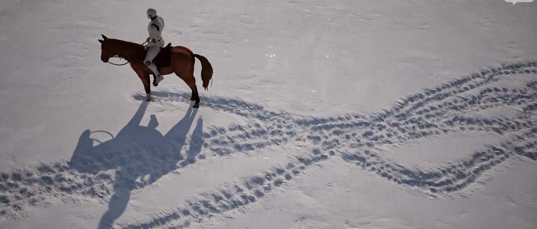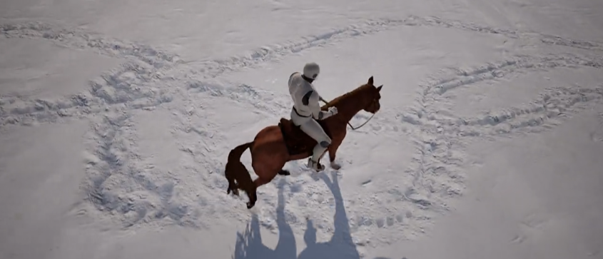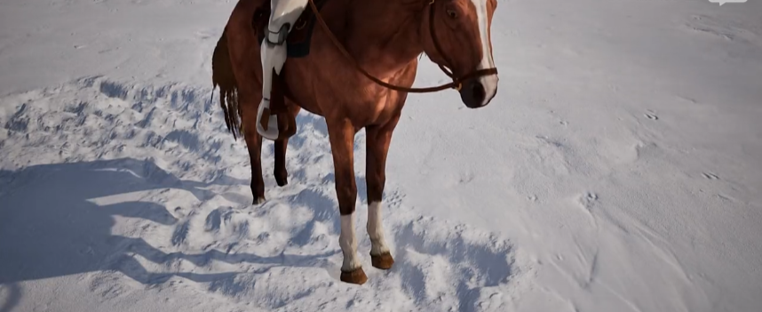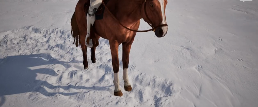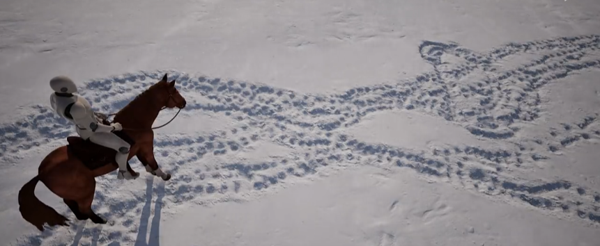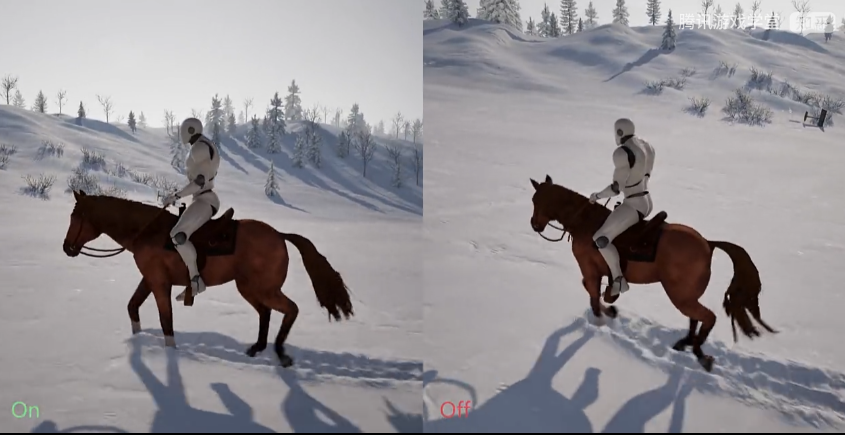 효과 스위치를 비교하면서, 말발굽과 캐릭터 주변의 눈의 역학을 주의 깊게 관찰하세요: