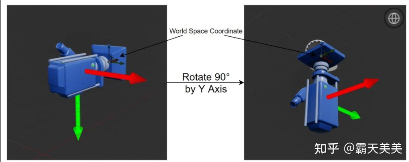 캡처 카메라를 만든 후 작성자는 캡처된 RT의 xy 축을 나타내기 위해 두 개의 빨간색과 녹색 화살표를 추가했습니다. 이는 RT를 샘플링할 때 uv 방향(왼쪽 위에서 오른쪽 아래로)이기도 합니다. 그런 다음 Y축을 중심으로 90도 회전하여 수직 위쪽으로 세워집니다. 아래 그림에서 볼 수 있듯이 이때 RT의 xy축은 월드 좌표의 xy 평면 축과 정확히 반대입니다. 왜냐하면 눈 재료가 RT를 샘플링할 때 월드 좌표의 xy 값은 uv로 변환됩니다. 샘플링을 위해서는 RT 캡처 축도 일치해야 합니다.