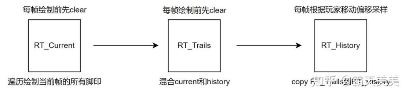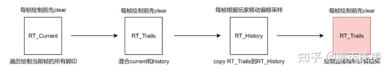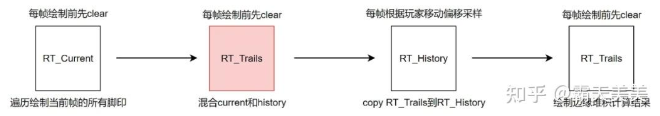 RT_Trails가 현재 프레임 RT_Current에 그려진 모든 발자국과 이전 프레임에 기록된 RT_History를 병합한 후, 현재 RT_Trails의 내용을 RT_History에 직접 복사하여 다음 프레임에서 병합할 때까지 보관합니다.