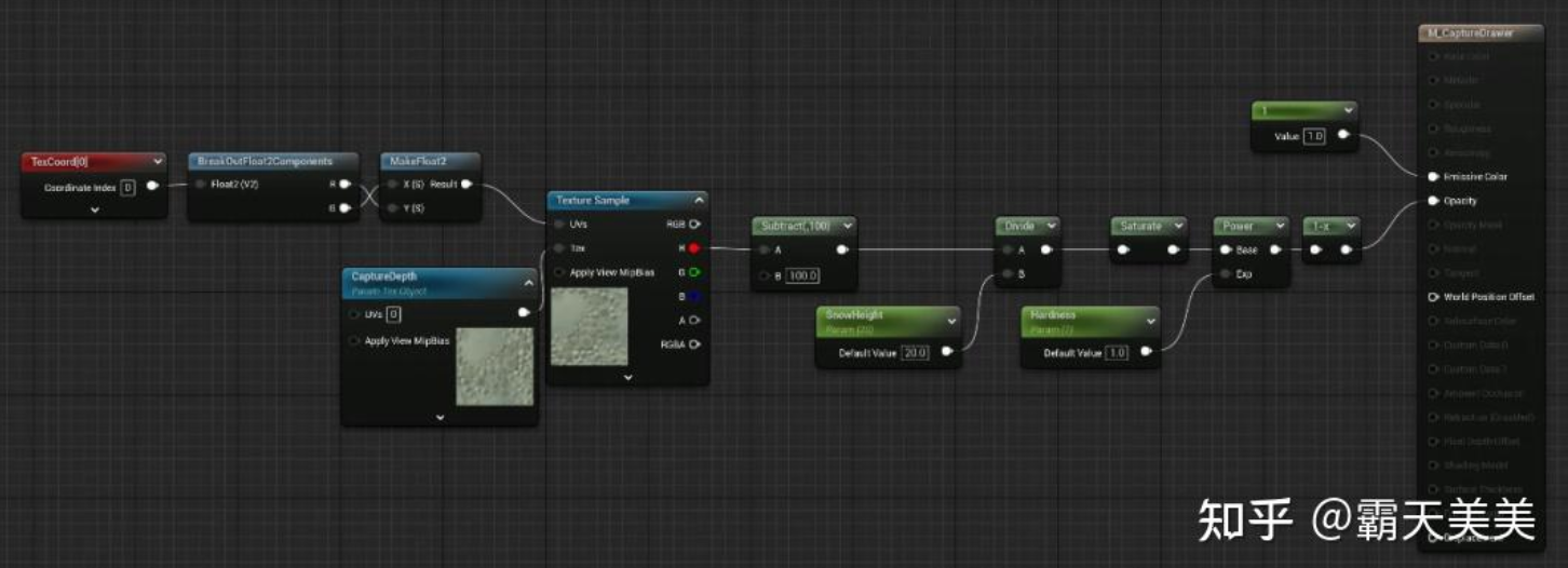 Blend Mode는 적용 범위가 겹치는 것을 방지하기 위해 여전히 반투명입니다. CaptureDepth는 캡처한 콘텐츠를 저장하고 깊이 정보를 기록하는 RT입니다. 샘플링 uv의 xy 값이 반전되어 위에서 언급한 캡처된 RT의 축 방향이 일관되지 않는 문제를 해결합니다. 100을 빼면 실제로 감지 대상의 지면 위치 바로 아래 100cm에서 캡처했기 때문에 감지 구성 요소의 차이가 보완됩니다. 눈의 두께로 나눈 값이 눈의 재질과 일치하여 최종적으로 높이 정보로 변환됩니다.
