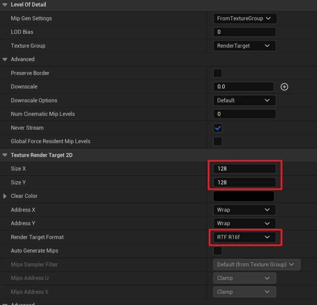 마지막으로, 캡처 결과를 저장하기 위해 이 작은 RT를 만드는 것을 잊지 마세요. 여기에서 사양 설정에 주의해야 합니다. 크기는 128x128로 더 작게 설정되고 렌더 타겟 형식은 16 정밀도를 사용해야 합니다. 왜냐하면 우리가 기록하는 것은 1보다 큰 값인 깊이 정보이기 때문입니다.