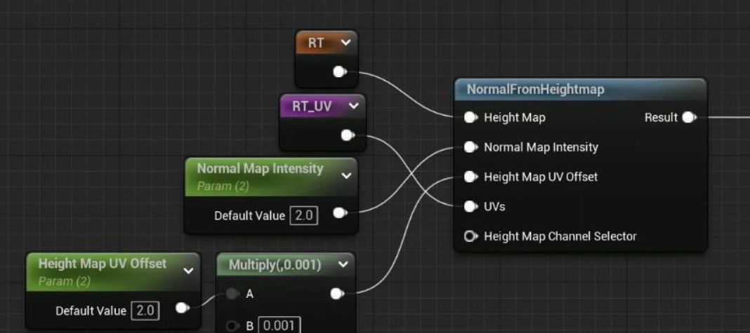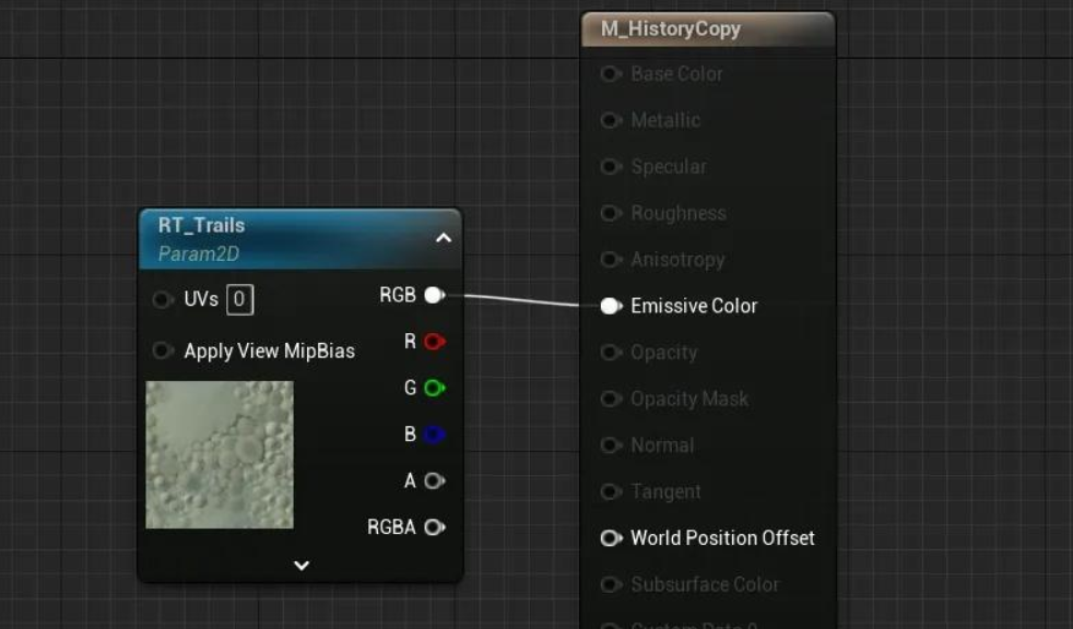 RT는 동시에 읽고 쓸 수 없습니다. 누적된 계산 결과를 저장하기 위해 다른 RT를 추가하시겠습니까? 당연히 아닙니다. RT_Trails를 RT_History에 복사한 후(이때 RT_Trails와 RT_History의 내용은 정확히 동일함), 위 그림의 왼쪽에 있는 TrailsBuffer 매개변수에 RT_History를 필요한 트랙 정보로 전달한 다음, 위 계산 결과를 RT_Trails에 플로팅할 수 있습니다. 계산 결과는 RT_History에 그려지지 않습니다. 각 프레임을 사용하기 전에 RT_History가 지워지지 않아 SpiralBlur 효과가 중첩되고, 터레인 머티리얼에서 RT_Trails를 샘플링하는 것이 설계에 더 부합하기 때문입니다.