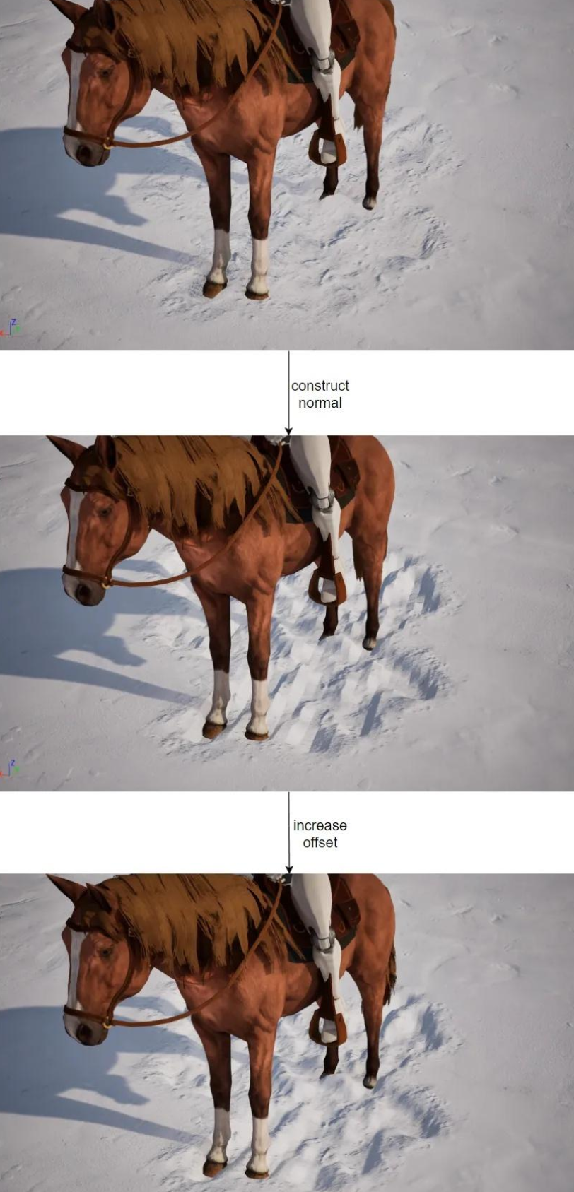 위 두 가지 그림자 처리 방법은 SIGGRAPH 2020에서 Naughty Dog가 공유한 Waylon Brinck와 Steven Tang의 The Technical Art of The Last of Us Part II의 Snow에 관한 부분에서 가져온 것입니다.