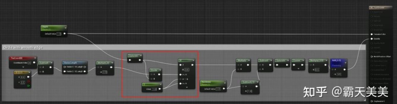 머티리얼에서 발자국 크기를 추가로 조절하여(블루프린트에서 계산된 반지름에 따라 설정되었지만) 트랙 두께 변경을 더 명확하게 만들 수 있습니다. 따라서 아래 그림의 빨간색 와이어프레임에 있는 계산이 추가되었습니다. 그런데, 머티리얼 에디터에서 if 노드를 사용하는 것을 두려워할 필요가 없습니다. 엔진 내부에서는 여전히 효율적인 방식으로 대체됩니다.