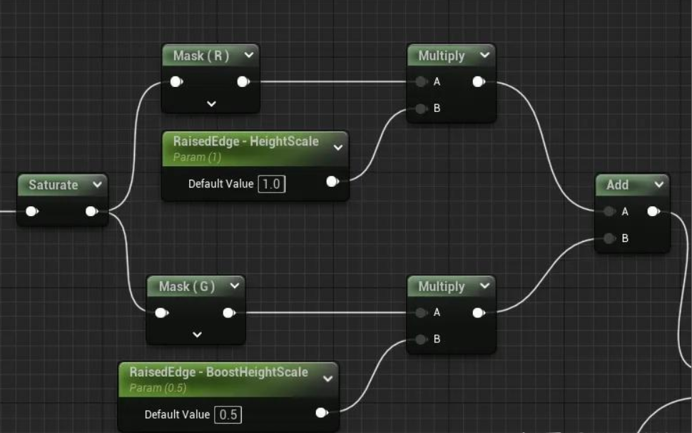 그런데, 이것은 쌓인 페인트 재료의 최종 버전입니다. 여기서는 다른 처리 없이 TrailsBuffer의 흐릿한 값만 최종 결과의 G 채널에 유지되며, 이는 후속 재질 맵 혼합을 위한 마스크로 사용됩니다.