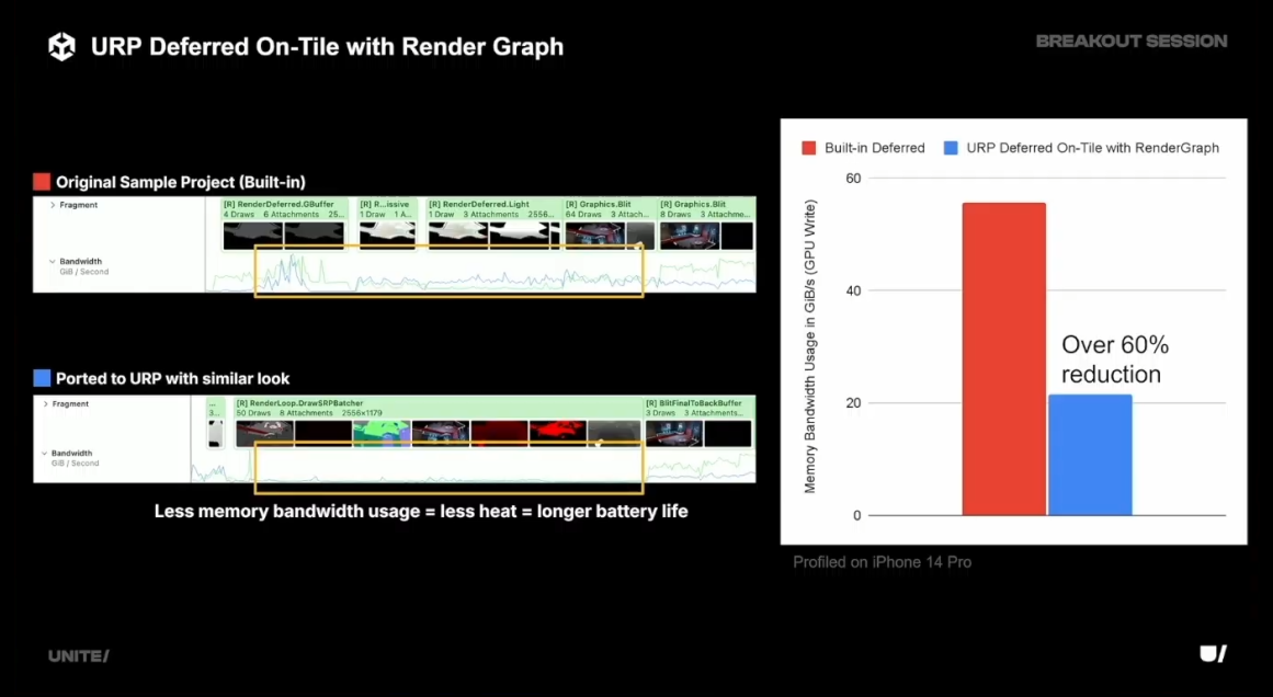 G-buffer 방식에서는 각 픽셀의 다양한 속성(예: 색상, 법선, 반사율 등)을 외부 메모리에 저장한 후, 이후 라이팅 단계에서 다시 이를 읽어와 조명을 계산한다. 이 과정에서 큰 용량의 데이터를 외부 메모리로 쓰고 읽는 작업이 반복되므로, 메모리 대역폭을 많이 사용하게 된다. 반면, Subpass를 사용하면 중간 데이터를 메모리에 기록하지 않고, 타일 기반 메모리 또는 온칩 메모리에서 직접 조명 계산을 수행할 수 있게되며, 이는 PLS와 결합될 때 더욱 효과적이며, 중간 데이터가 메인 메모리로 가지 않고 GPU 내부에서만 처리되기 때문에 메모리 대역폭 사용량을 크게 줄일 수 있게 된다.