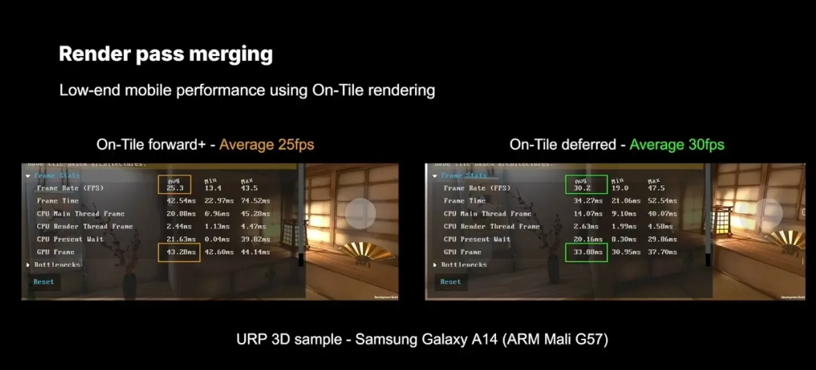 G-buffer 방식은 다수의 렌더 타겟을 생성하고 이를 읽고 쓰는 과정에서 성능 저하가 발생할 수 있다. 특히 모바일 플랫폼에서는 메모리 접근이 병목이 되는 경우가 많아, 여러 개의 G-buffer를 외부 메모리에 기록하고 이를 다시 읽어오는 과정에서 성능이 저하될 수 있다. Subpass에서는 렌더링의 여러 단계가 연속적으로 처리될 수 있으며, 각 Subpass에서 데이터를 재사용할 때 메모리 접근을 최소화할 수 있다. 따라서 메모리 접근 횟수를 줄여 성능 향상을 기대할 수 있으며, 모바일 GPU의 타일 기반 렌더링에서는 특히 유리한 방식이다.