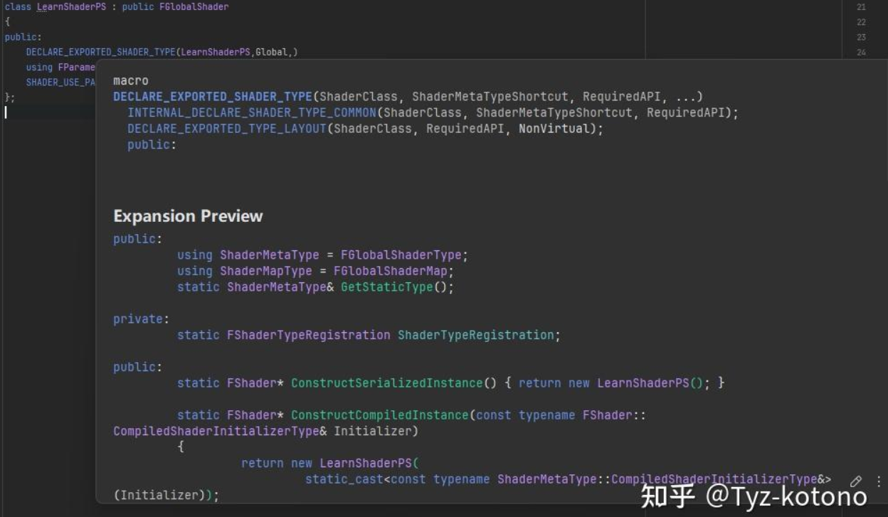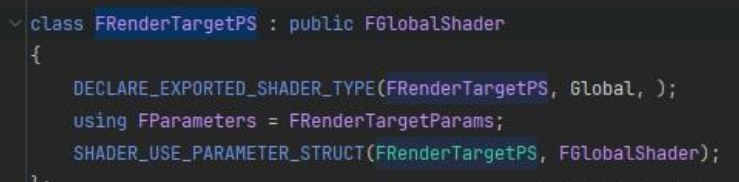 그중에서 DECLARE_EXPORTED_SHADER_TYPE의 정의를 볼 수 있습니다. 이 매크로는 셰이더 유형을 선언하는 데 사용되며, 여기서는 Global Shader로 선언됩니다.