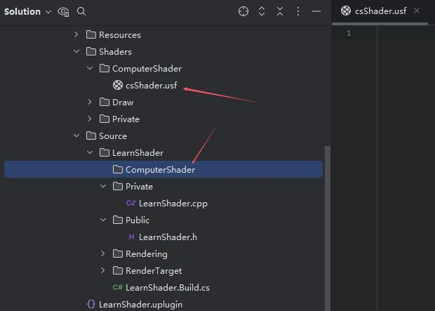 먼저 Shaders 및 LearnShader 아래에 폴더를 하나, usf용으로 하나, 메인 로직용으로 하나를 만듭니다.