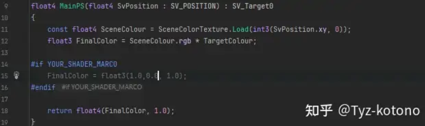 //LearnShader.h #pragma once #include "CoreMinimal.h" #include "DataDrivenShaderPlatformInfo.h" #include "SceneTexturesConfig.h" #include "PostProcess/PostProcessInputs.h" //Shader Property Struct BEGIN_SHADER_PARAMETER_STRUCT(FColourExtractParams,) // define color and texutre parameter SHADER_PARAMETER(FVector3f, TargetColour) SHADER_PARAMETER_RDG_TEXTURE(Texture2D, SceneColorTexture) SHADER_PARAMETER_STRUCT_INCLUDE(FSceneTextureShaderParameters, SceneTextures) //Binding render targets at runtime RENDER_TARGET_BINDING_SLOTS() END_SHADER_PARAMETER_STRUCT() class FLearnShaderPS : public FGlobalShader { public: //Generate shader type and serialize DECLARE_EXPORTED_SHADER_TYPE(FLearnShaderPS,Global,) using FParameters = FColourExtractParams; SHADER_USE_PARAMETER_STRUCT(FLearnShaderPS, FGlobalShader); //Determine whether the shader should be compiled in some cases static bool ShouldCompilePermutation(const FGlobalShaderPermutationParameters& Parameters) { return IsFeatureLevelSupported(Parameters.Platform, ERHIFeatureLevel::SM5); } static void ModifyCompilationEnvironment(const FGlobalShaderPermutationParameters& Parameters, FShaderCompilerEnvironment& OutEnvironment) { FGlobalShader::ModifyCompilationEnvironment(Parameters, OutEnvironment); //SET_SHADER_DEFINE(OutEnvironment, YOUR_SHADER_MARCO, 0); } }; |