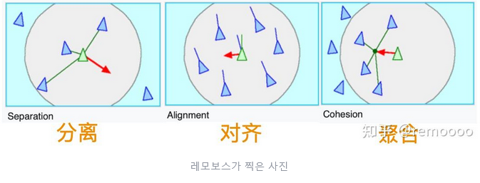 이 세 가지는 군집 행동(Flocking behavior)에서 중요한 개념으로, Separation(분리), Alignment(정렬), Cohesion(응집)의 세 가지 규칙을 기반으로 군집을 형성하는 메커니즘을 설명합니다.