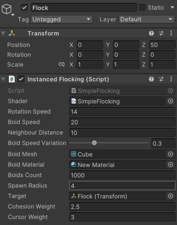 { float3 position; float3 direction; float noise_offset; }; RWStructuredBuffer<Boid> boidsBuffer; float time; float deltaTime; float rotationSpeed; float boidSpeed; float boidSpeedVariation; float3 flockPosition; float neighbourDistance; int boidsCount; float cohesionWeight; float3 cursor; float cursorWeight; |