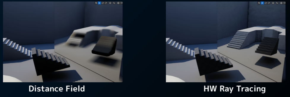 ● 단점 : DistanceField에 비해 높은 부하가 발생하기 쉽다. 하드웨어 레이 트레이싱을 지원하는 최신 GPU 필요
