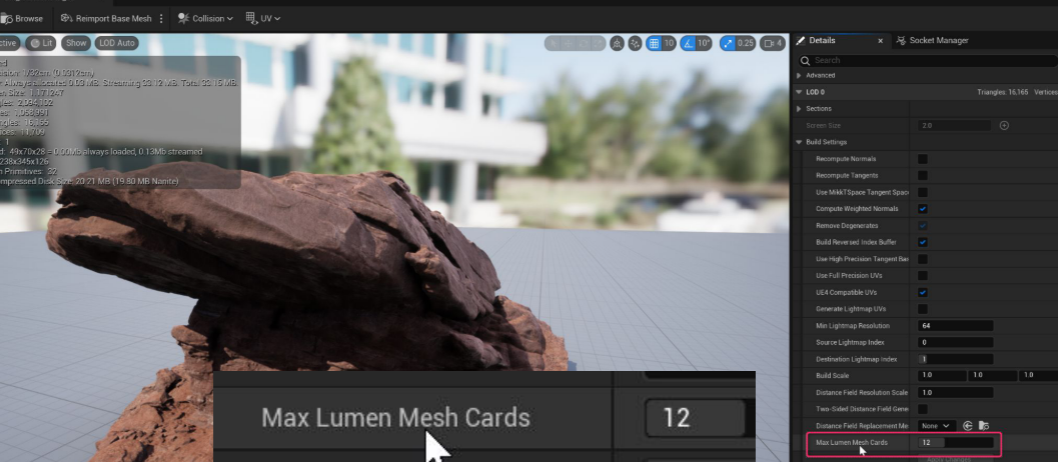 Lumen Scene에 넣을 오브젝트의 거리와 화면상의 크기를 설정한다.