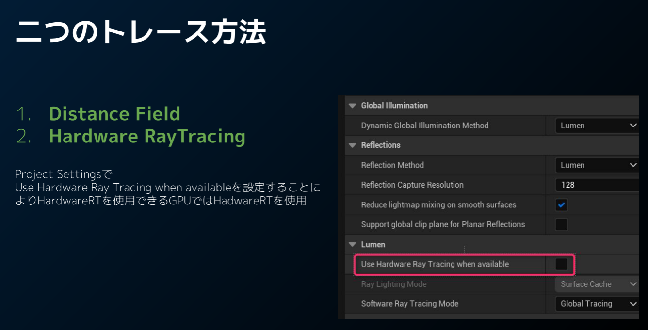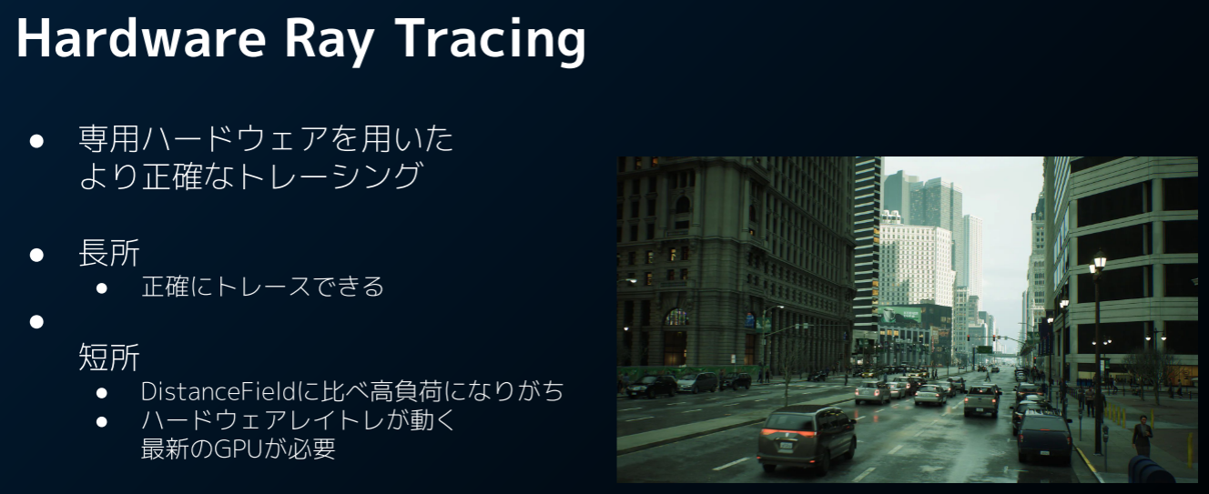 Lumen은 하드웨어 레이 트레이싱으로만 구현할 수 있다. 하드웨어 레이 트레이싱은 Lumen의 트레이싱 부분만 처리하므로 기존 레이 트레이싱 GI보다 훨씬 무거워지지 않는다.