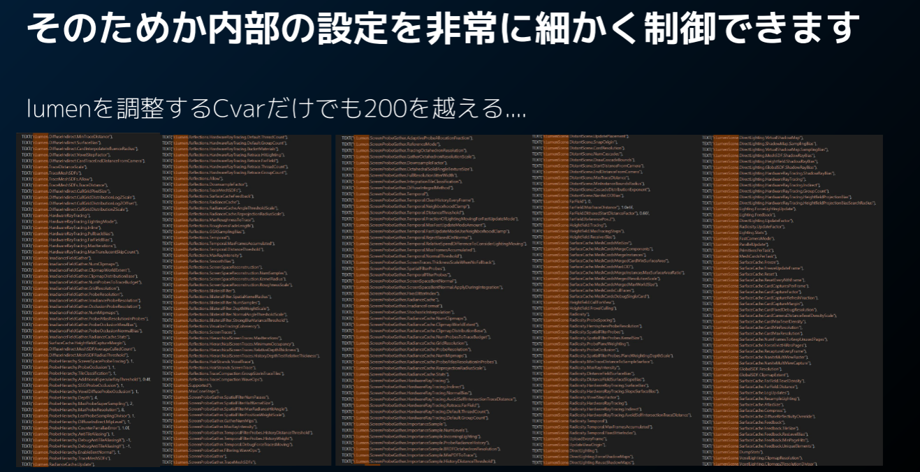 UE5のLumenに関して、Tiwtter上で呟いたTipsなどをこちらにまとめていこうと思います。見づらくてごめんなさい!Lumen GIやLumen Sceneなど全体の設定についてLum…