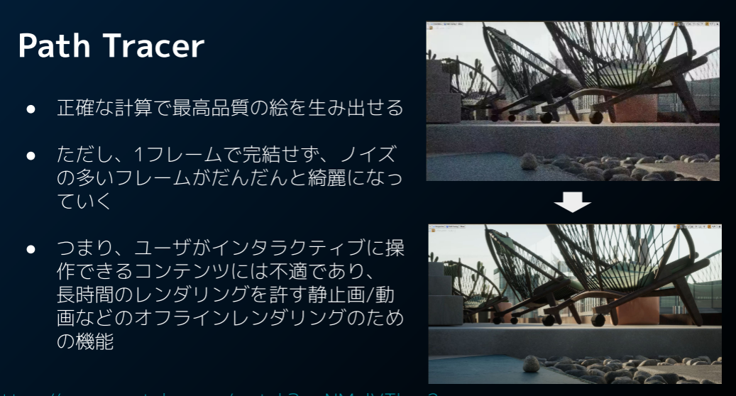 ● 즉, 사용자가 대화식으로 조작할 수 있는 콘텐츠에는 부적절하며 장시간 렌더링을 허용하는 스틸 이미지/동영상 등의 오프라인 렌더링을 위한 기능