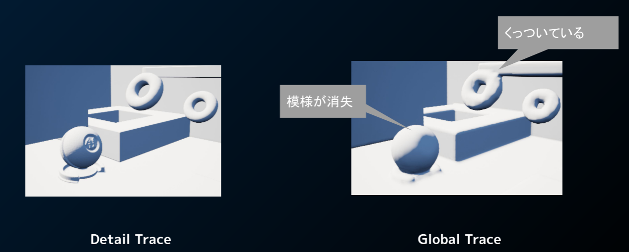 ● Distance Field의 계산에서는, 근거리에 있는 각 메쉬를 Detail Trace한 후, 히트하지 않으면 Global Trace를 하도록 하고 있다