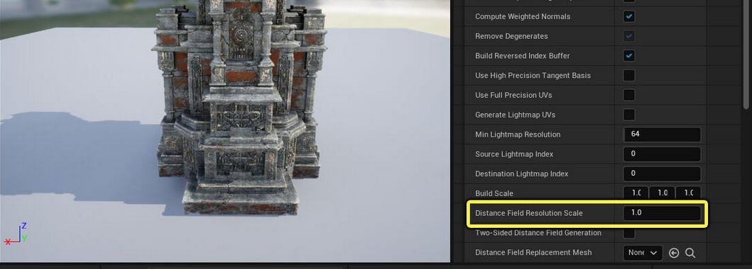 디스턴스 필드 표현을 개선하는 방법에는 2가지가 있습니다. 프로젝트들은 프로젝트 전체에 영향을 미치는 디스턴스 필드 복셀 밀도(Distance Field Voxel Density) 옵션 수치를 올려 개선을 도모할 수 있습니다. 또한, 스태틱 메시 에디터에 있는 디스턴스 필드 해상도 스케일(Distance Field Resolution Scale)을 조절하여 소프트웨어 레이트레이싱에서 문제를 일으키는 메시들에 대해서만 옵션을 지정할 수 있습니다. 디스턴스 필드의 해상도나 밀도를 올리는 것은 프로젝트의 크기를 키우게 될 것입니다. 출처 : https://tistory.jeon.sh/26